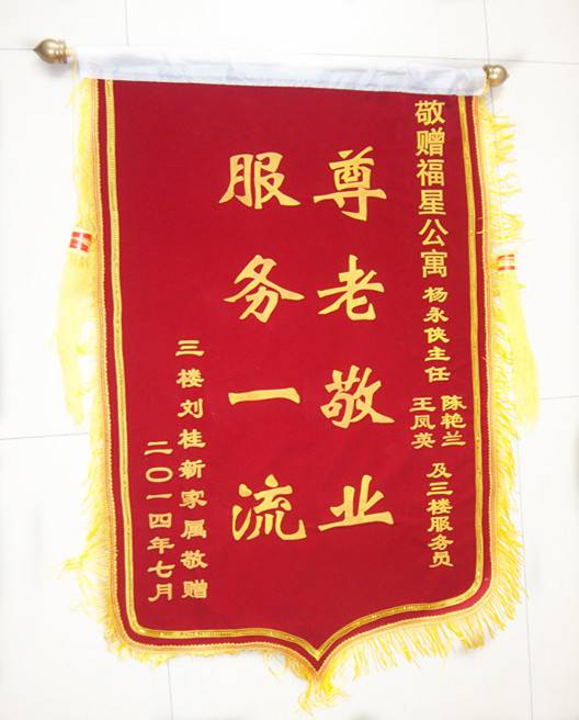 一天上午,刘桂新老人的儿子来到了公寓办公室,郑重地将一面锦旗赠送给了福星公寓,表扬护理部杨永霞主任和护理员王凤英、陈艳兰及全体护理班组,真诚地感谢他们几年来对刘桂新老人的精心护理,锦旗上写着“服务一流,尊老敬老”,充分肯定了护理员的敬业精神,这是福星公寓护理员职业道德的具体体现,也是福星公寓多少年来对员工爱岗敬业精神要求的实际行动的彰显。